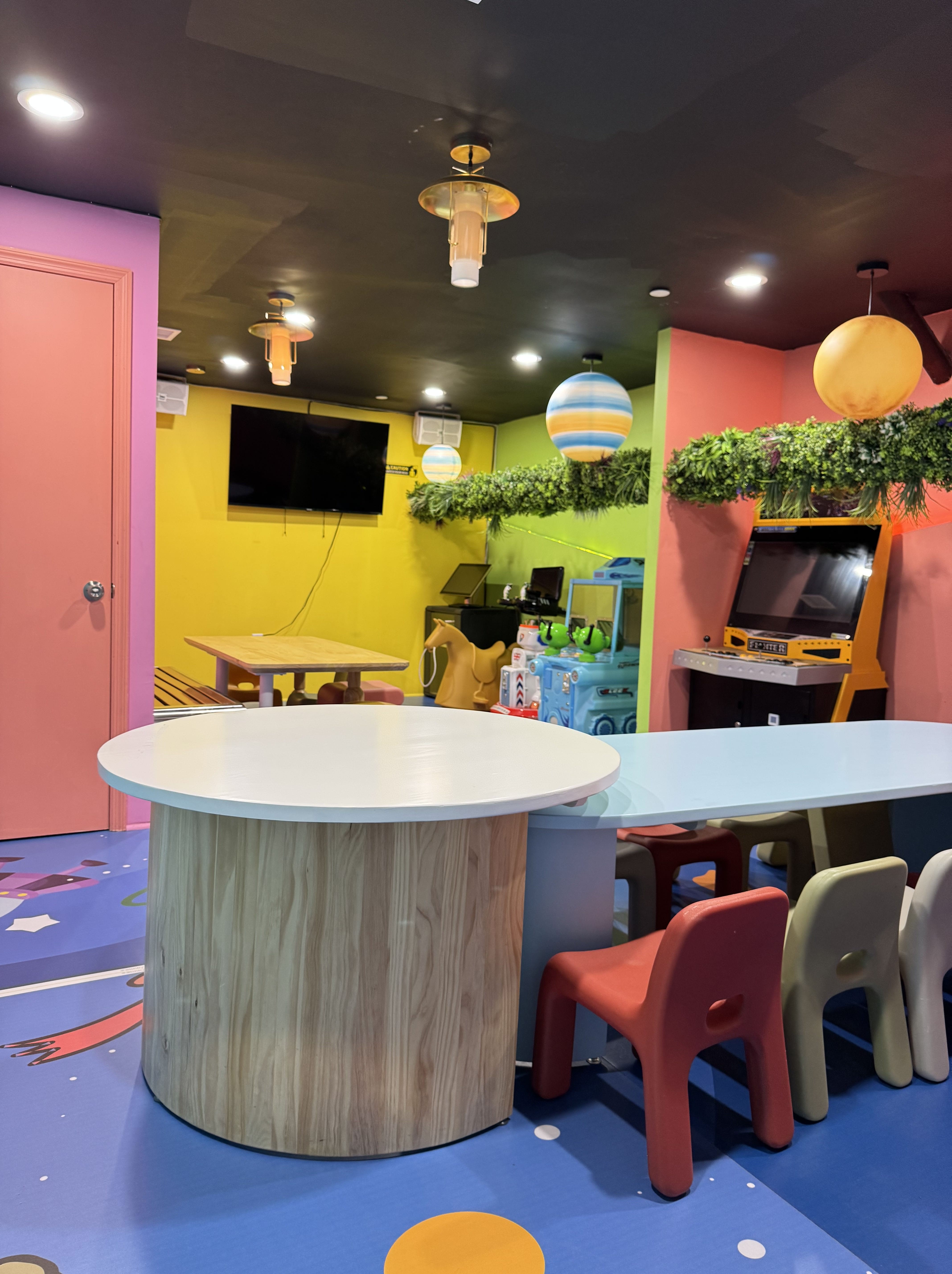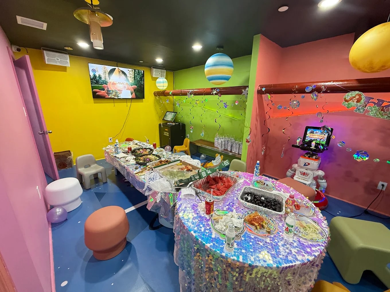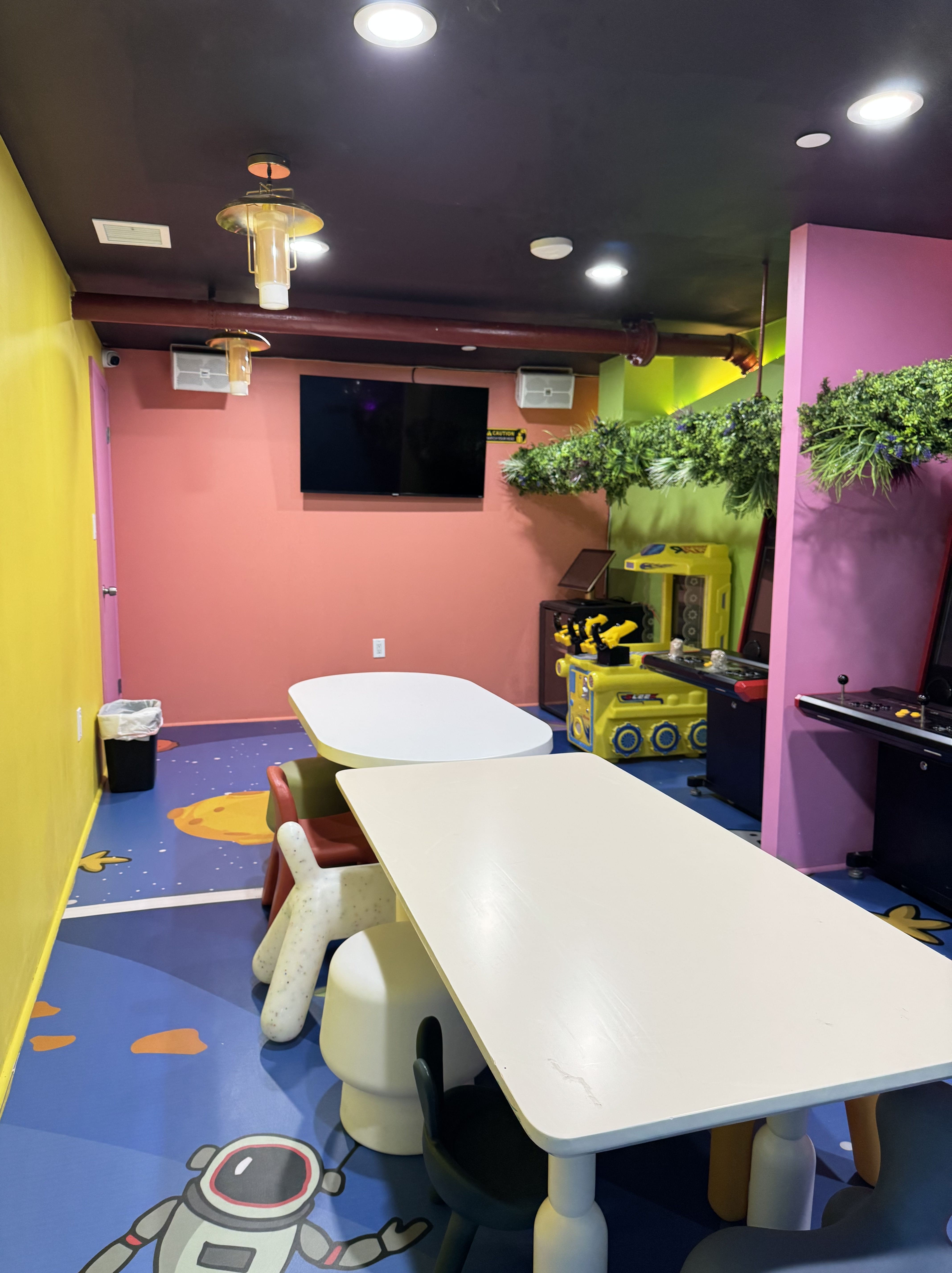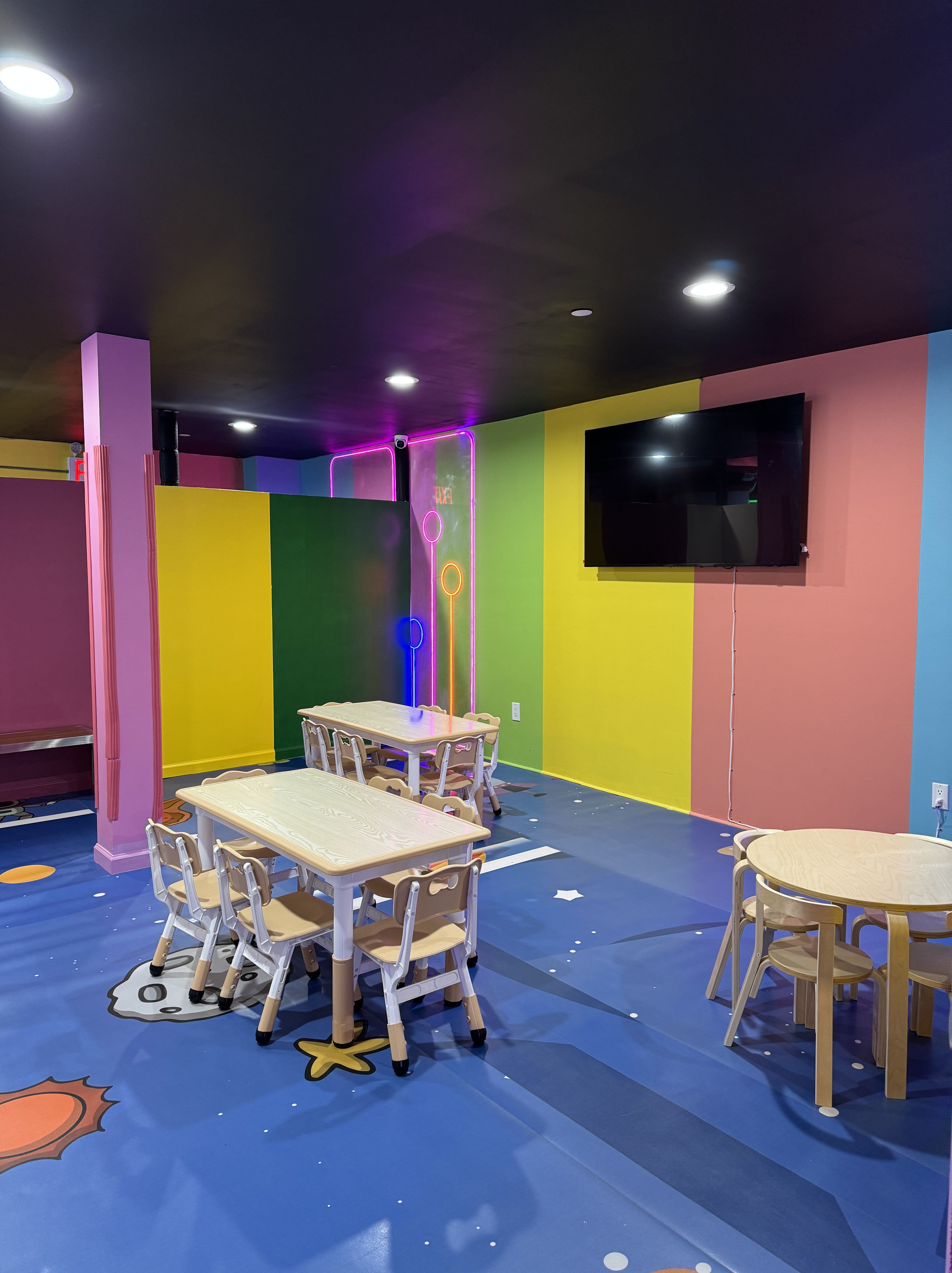 Galactic Attractions: Explore our zero-gravity zones! Jump on our trampolines, zoom down space slides, swing among the stars, and let the little astronauts explore the soft landing of our ball pit. Plus, challenge your crew in our all-ages arcade station!